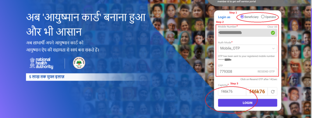 સ્ટેપ 2: આયુષ્માન કાર્ડ 2026 Beneficiary વિકલ્પ પસંદ કરો અને મોબાઇલ નંબર દાખલ કરો